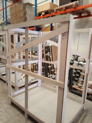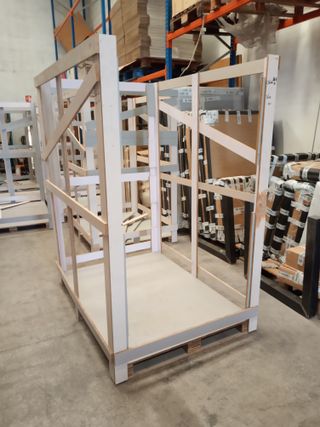 Estructura de madera robusta, ideal para el transporte seguro de mercancías. Medidas ancho 110 cm, largo 140/150 cm y alto 185 cm. Tengo varias unidades. - Construcción de madera. - Diseño tipo jaula para ventilación y visibilidad. - Base de palet integrada para facilitar el movimiento.