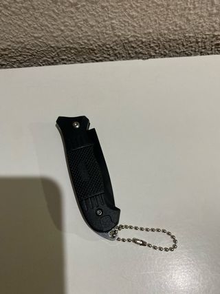 Navaja plegable de color negro con un diseño compacto y un llavero incorporado. - Hoja de metal. - Mango texturizado para un mejor agarre. - Incluye cadena de bolitas para llavero.