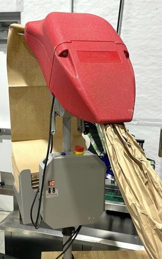 Máquina dispensadora de papel para embalaje, ideal para proteger envíos. - Color rojo y gris. - Panel de control con pantalla digital.