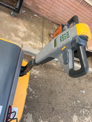 Transpaleta eléctrica MHL en buen estado. - Color amarillo. - Logo MHL Forklift visible. - Número de teléfono: 96 357 53 61.