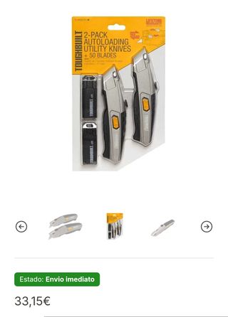 Pack 2 facas multiusos com carregamento automatico TB-H4S52-20 TOUGHBUILT Ref.: TB-H4S52-20 Características técnicas: Cabo de alta qualidade Design ergonômico com enchimento de borracha 2 alças por pacote 50 lâminas de reposição Lâminas de troca rápida Carregador automático de 5 lâminas Caixa de fácil abertura Carcaça de zinco endurecido Aperto de borracha de toque suave