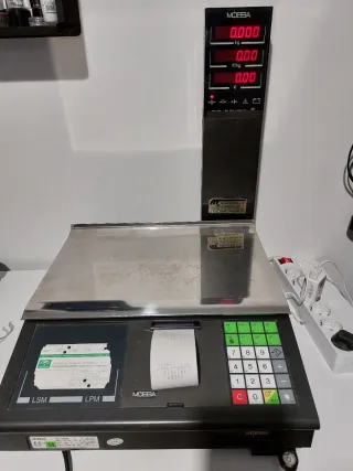 Balanza digital Mobba, ideal para comercios. Cuenta con pantalla LED y teclado numérico. - Bandeja de acero inoxidable. - Impresora de tickets integrada. - Indicador de peso, precio por kg y precio total. - Modelo: LSM/LPM