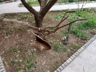 Arado antiguo de labranza, ideal para coleccionistas o decoración rústica. - Estructura metálica oxidada. - Mango de madera. - Pieza de labranza tradicional. Se escuchando ofertas No se envía