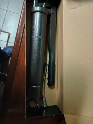 Herramienta para aplicar grasa de forma controlada. - Cuerpo metálico. - Palanca de acción manual. - Manguera flexible con acople.