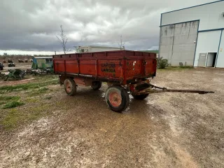 Remolque agrícola de gran capacidad, ideal para transporte. - Estructura metálica robusta. - Ruedas de gran tamaño. - Sistema de enganche. - Puerta trasera abatible.