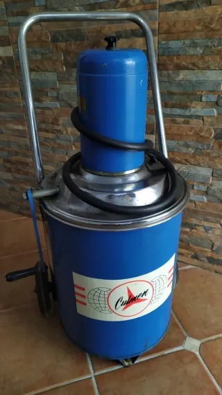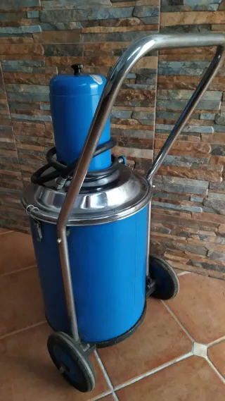 Dispensador manual con bomba para añadir aceite a cajas de cambios con una capacidad de 70 litros. Su diseño es robusto y está fabricado en metal, azul y cromo, con ruedas para su desplazamiento. - Capacidad: 70 L - Material: Metal - Color: Azul y cromo - Operación: Manual - Manguera de 1.65 m de longitud.