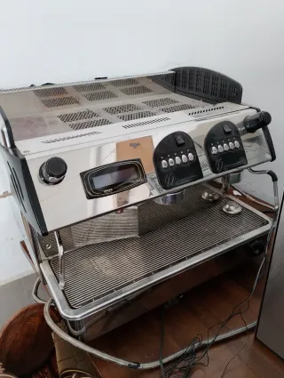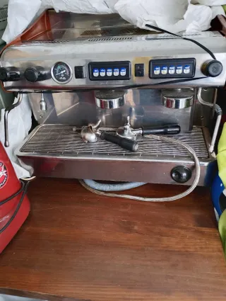 Cafetera industrial de acero inoxidable con molinillos integrados. Ideal para negocios de hostelería. - Diseño robusto y duradero. - Panel de control con botones. - Manómetro para control de presión. - Portafiltros de metal.