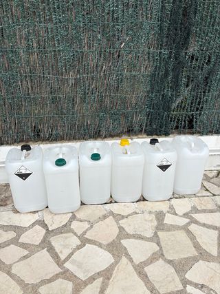 Se venden 6 bidones de plástico de 25 litros cada uno. Son ideales para almacenar líquidos. - Capacidad: 25 L - Material: Plástico - Color: Blanco - Tapón de seguridad 5€ por bidon