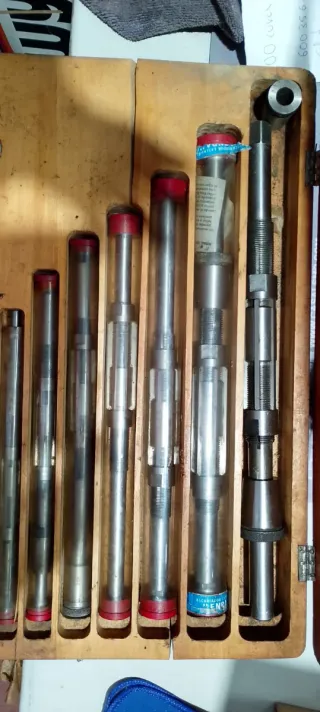 Estuche antiguo de escariadores, nunca usado. Contiene 9 piezas. - Estuche de madera original - Escariadores extensibles de acero de primera calidad. Entrega en San Leonardo, Soria o en Alcobendas.