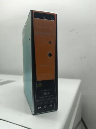 Fuente de alimentación conmutada de la marca Weidmüller, modelo PROeco. - Salida: 24V, 3A. - Entrada: 100-240V, 2-1A, 50/60Hz. - Conexiones de entrada L(+), N(-) y PE.
