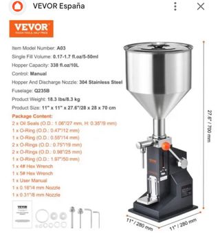Máquina llenadora de líquidos y pasta VEVOR, modelo A03. Ideal para dosificar con precisión. - Capacidad de tolva: 10L. - Volumen de llenado: 5-50ml. - Material de la tolva y boquilla: Acero inoxidable 304. - Incluye varias juntas tóricas y boquillas de diferentes tamaños. - Incluye llaves Allen y manual de usuario. - Tengo varias unidades