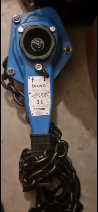 polipasto manual de palanca con cadena, concretamente un modelo Bravo de la marca Tractel, con capacidad de hasta 3 toneladas para levantar, tirar o tensar cargas pesadas en trabajos industriales, construcción, agricultura, talleres, etc.