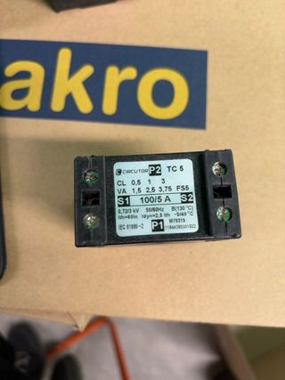 Transformador de corriente CIRCUTOR modelo TC5. DISPONIBLES 3 UNIDADES, SE HACE PRECIO POR EL CONJUNTO. - Intensidad nominal: 100/5 A. - Tensión nominal: 0,72/3 kV. - Frecuencia: 50/60 Hz. - Clase de protección: IP40.