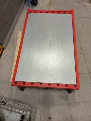 Carro de plataforma con estructura metálica y ruedas. - Color rojo. - Plataforma de carga. - Ruedas para fácil desplazamiento. Medidas 80 cm ancho por 133 cm largo con 2 barras transversales para cargar