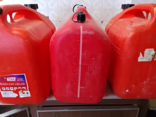 Lote de tres garrafas de plástico de 20 litros cada una. Son ideales para almacenar y transportar líquidos. - Color rojo. - Capacidad de 20L. - Incluyen asa para facilitar el transporte. - Marcaje de nivel de llenado.
