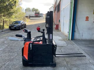 Apilador eléctrico Linde en perfecto estado. Dispone de elevación de patas muy útil para salvar pequeñas rampas y elevación libre para elevar el mástil y poder trabajar en techos bajos y plataforma abatible para conductor. - Altura de elevación: 2990 mm - Capacidad de carga: 1200 kg - Modelo: Linde L12 AP