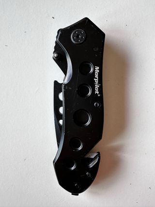 Navaja táctica de color negro con el logo de Morpilot. - Diseño con múltiples orificios. - Incluye cortador de cinturón de seguridad y rompecristales.
