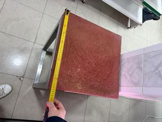 Mesa de trabajo con superficie roja y estructura metálica. - Superficie de corte resistente. - Estructura de metal. - Bandeja inferior de acero inoxidable.