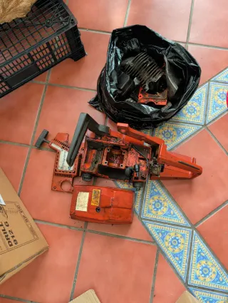 Motosierra Husqvarna 40 desmontada para piezas o reparación. Se vende tal como se ve en las imágenes. Pistón y cilindro en buen estado - Carcasa principal de plástico rojo. - Cilindro y otras piezas en bolsa negra. - Asa delantera y trasera. - Tapa inferior roja.