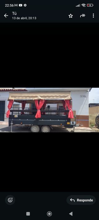 Se alquila remolque ideal para romerías. Es de color verde oscuro y tiene capacidad para 20-22personas. - Incluye toldo beige. - Dispone de asientos acolchados. - Estructura metálica resistente. TOTALMENTE EQUIPADA