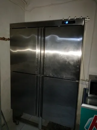 Nevera industrial de acero inoxidable con cuatro puertas. Ancho 1250cm. Ondo 670 cm. Alto 2050 cm. - Diseño moderno y robusto. - Acabado brillante. - Panel de control digital.