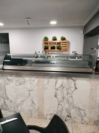 Mostrador refrigerante y vitrina con acabado en mármol y detalles dorados. - Estructura de mármol. - Detalles metálicos dorados.