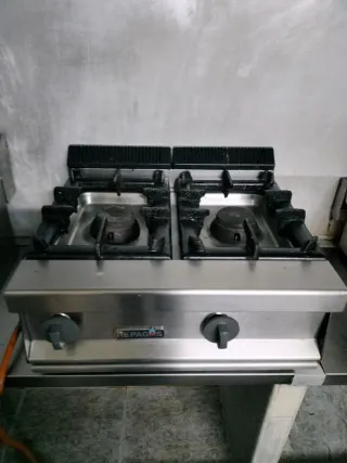 Cocina industrial de dos fuegos con quemadores de gas. Fabricada en acero inoxidable, es robusta y fácil de limpiar. - Dos quemadores de gas. - Encimera de acero inoxidable. - Mandos frontales. - 60 cm de ancho - 56 cm Ondo. - 30cm alto