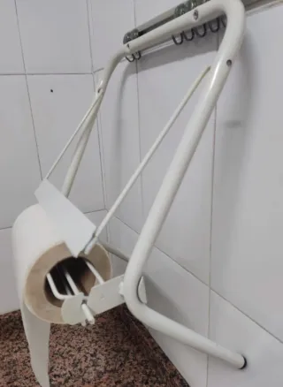 Portarrollos de cocina de estilo industrial, con un diseño sencillo y funcional. - Estructura metálica blanca. - Soporte para rollo de papel. - Cuchilla serrada para corte.