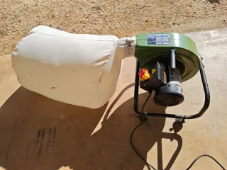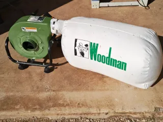 Aspiradora de polvo industrial marca Woodman, ideal para talleres. - Motor potente. - Bolsa recolectora de tela. - Base con ruedas para fácil movilidad.