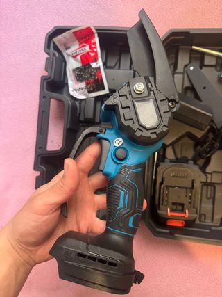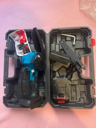 Mini motosierra de poda a batería de 21V, ideal para trabajos en el jardín. Incluye un kit completo para empezar a usarla. - Diseño compacto y ligero. - Batería recargable de 21V. - Incluye cadena y espada. - Maletín para transporte y almacenamiento.