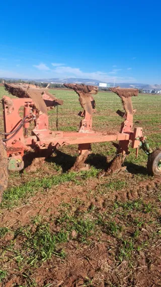 Arado de vertedera con tres cuerpos para tractor. - Tres rejas de arado. - Estructura robusta de color naranja. - Rueda de control de profundidad.