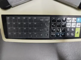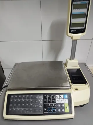 Balanza digital GRAM MS-33P con teclado numérico y pantalla. - Bandeja de pesaje de acero inoxidable. - Teclado con teclas de función y numéricas. - Pantalla digital para visualización de peso y precio. - Impresora integrada para tickets.