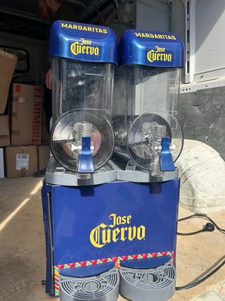 Máquina de granizados de la marca Jose Cuervo, ideal para preparar bebidas frías. - Dos dispensadores. - Diseño azul con detalles. - Incluye vasos de papel apilados.