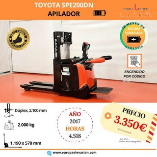 MÁQUINA FABRICADA EN 2017. CON TAN SOLO 4.518 HORAS DE USO. BATERÍA VERIFICADA CON 12 MESES DE GARANTÍA. ENCENDIDO POR CÓDIGO. Apilador eléctrico TOYOTA. Capacidad: 2.000 kg. Tamaño de horquillas: 1.190 x 570 mm. Mástil dúplex, 2.100 mm. Respuesta rápida, eficiencia y muy buena maniobrabilidad. Ref: 2576. Modelo: SPE200DN. Europa Elevación. ¡Tenemos tu máquina! Llámanos sin compromiso. Disponemos de atención comercial 24 horas. Enviamos a toda España.