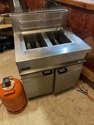 Freidora industrial de gas con doble cubeta de 25 litros cada una. Fabricada en acero inoxidable. - Doble cubeta de 25L. - Funcionamiento a gas. - Construcción en acero inoxidable.