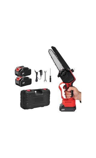 Mini motosierra eléctrica de 6 pulgadas, ideal para trabajos de jardinería o bricolaje. Incluye dos baterías de 21V para mayor autonomía, cargador, llave inglesa, destornillador y un maletín de transporte. - Motosierra compacta de 6 pulgadas. - Dos baterías de 21V incluidas. - Cargador. - Herramientas de montaje (llave y destornillador). - Maletín rígido para almacenamiento y transporte.