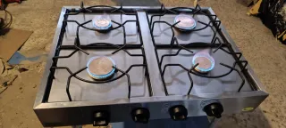 Cocina industrial de acero inoxidable con cuatro quemadores. - Superficie de acero inoxidable. - Parrillas de hierro fundido. - Mandos frontales. -medidas. 80 cm de ancho 60 de fondo 15 de alto