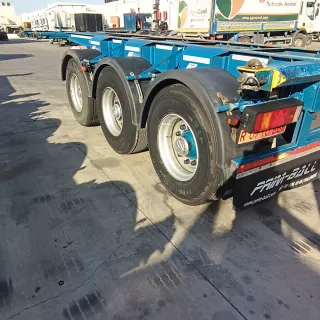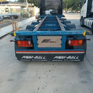 Semirremolque portacontenedor diseñado para contenedores de 20 pies. Cuenta con una estructura robusta y un diseño funcional. - Marca: Prim-Ball