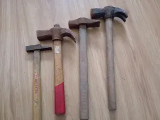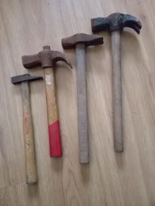 Se vende lote de cuatro martillos de diferentes tamaños y estilos. - Martillo Bellota. - Martillo con mango de madera y detalle rojo. - Martillo con mango de madera gris. - Martillo con mango de madera desgastado.