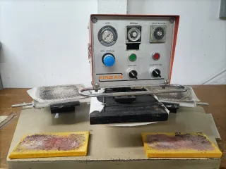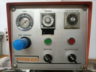 Plancha de transfer de la marca Firsan. - Panel de control con manómetros para aire y presión. - Indicadores luminosos para marcha y calefacción. - Regulador de presión. - Temporizador de calefacción.