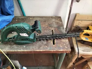 Cortasetos eléctrico en color verde, ideal para el mantenimiento de jardines. - Cuchillas afiladas para un corte preciso. - Mango ergonómico para un agarre cómodo.