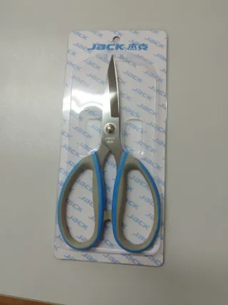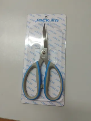 Tijeras de la marca Jack, diseñadas para textiles. Son ideales para trabajos de costura. - Hojas de acero inoxidable. - Mangos ergonómicos en azul y gris.