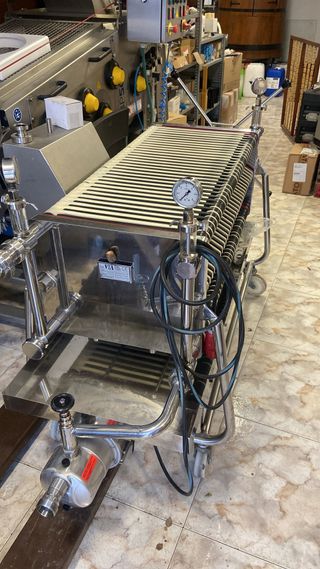 Filtro de placas de 40x40 cm, ideal para procesos de filtración. - Construcción en acero inoxidable. - Incluye manómetro para control de presión. - Ruedas para facilitar su movilidad.