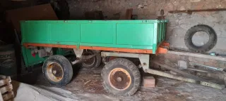 Remolque agrícola con caja de medidas 3.00 metros de largo, 1.78 metros de ancho y 0.50 metros de alto. - Color verde y naranja. - Dos ejes con ruedas. - Puerta trasera abatible. Se regalan vertederas de dos cuerpos manuales