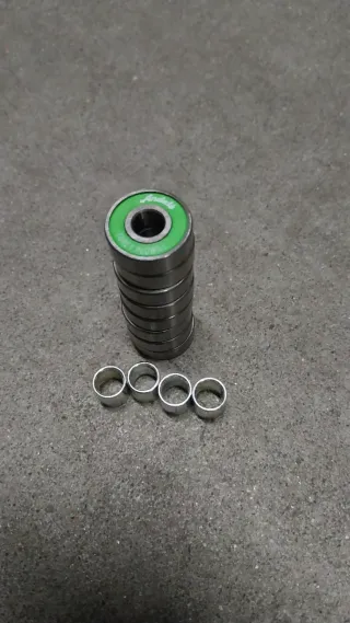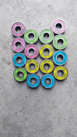 Pack de 16 rodamientos ABEC-9 608 RS. Se han engrasado para probarlos en unas ruedas y han rodado 500 m. - Rodamientos de alta precisión. - Ideales para patines, monopatines y scooters. - Colores variados: rosa, verde, amarillo y azul.
