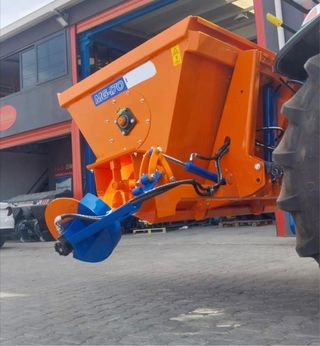 Esparcidor de estiercol MG-170 en color naranja y azul. - Modelo MG-170. - Estructura metálica. - Cilindro hidráulico.