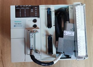 PLC en perfectas condiciones de funcionamiento, solo se ha usado a nivel didáctico y por eso incluye los interfaces de entradas y salidas para una simulación completa. El kit incluye: - PLC Schneider Electric TSX3722001. - Módulo de expansión TSXDMZ28DR. - Módulo de interfaz ABE7 TES160.