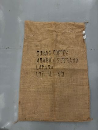Saco de yute con inscripciones relacionadas con café de Cuba. Medidas aproximadas 1 metro de largo y 70cm ancho. Yute fino de trama sencilla. Presenta marcas de extracción de muestras de café