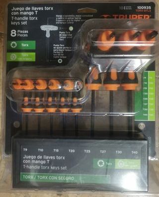 Set de 8 llaves Torx con mango en T, ideal para trabajos que requieren precisión y control. - Incluye tamaños T9, T10, T15, T20, T25, T27, T30 y T40. - Mango ergonómico para mayor comodidad y control. - Puntas Torx de seguridad (Tamper proof). - Puntas Torx con ajuste perfecto para mayor torque. Juego formado por 8 llaves Torx fabricadas en acero al cromo vanadio, de doble punta con seguro y sin seguro. Con mango en "T" confort grip que permite trabajar con mayor comodidad. Incluye estuche de plástico