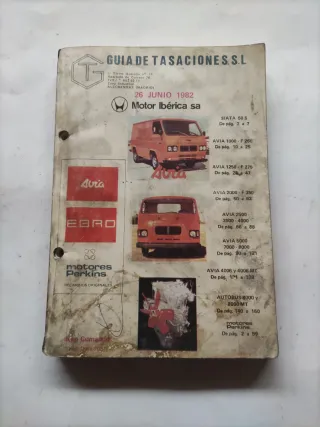 Guía de tasaciones de vehículos de Motor Ibérica S.A. de junio de 1982. - Incluye modelos Avia, Siata y Jeep Comando. EBRO - Cubre diferentes rangos de motores y modelos. - Detalla páginas de referencia para cada modelo.